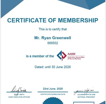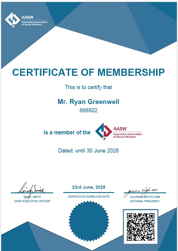 Ryan Greenwell is an Accredited Social Worker and a member of the Australian Association of Social Work.