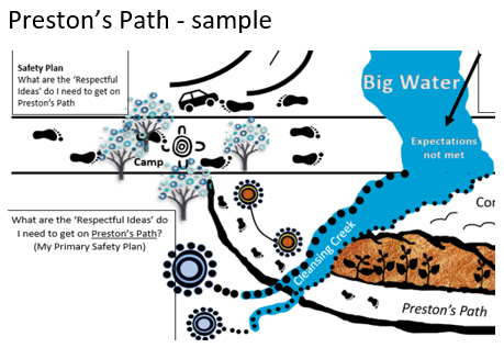 Preston's Path is a respectful and culturally relevant tool for Aboriginal men to acknowledge their abusive actions and design tailor-made safety plans. It uses country and nature symbols such as water, trees, tracks, animals, paths, camping and roads.