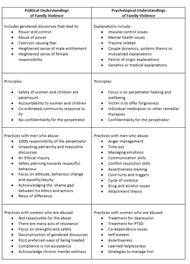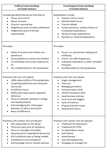In contrast, a political understanding of family violence scrutinizes the societal norms that perpetuate the roles of power and control within relationships. This perspective highlights how societal structures and cultural norms create a breeding ground for violence through constructs such as male entitlement and female responsibility. Such a framework views family violence not just as a personal issue but as a complex interplay of societal expectations and individual actions. See the table below that summarizes these understandings.